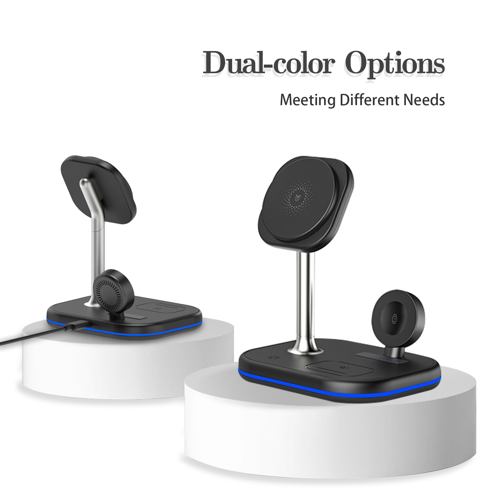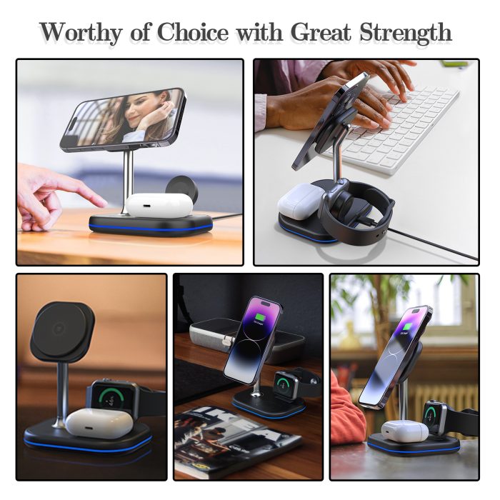 - Clean and tidy, helps you end the mess cords life-Forget about messing with cables and cases. Just set your device on the wireless charger desktop station and let the power flow. Supporting 18W for fast charging total, the phones, Airpods case, and iWatch charging area of the wireless phone charger.