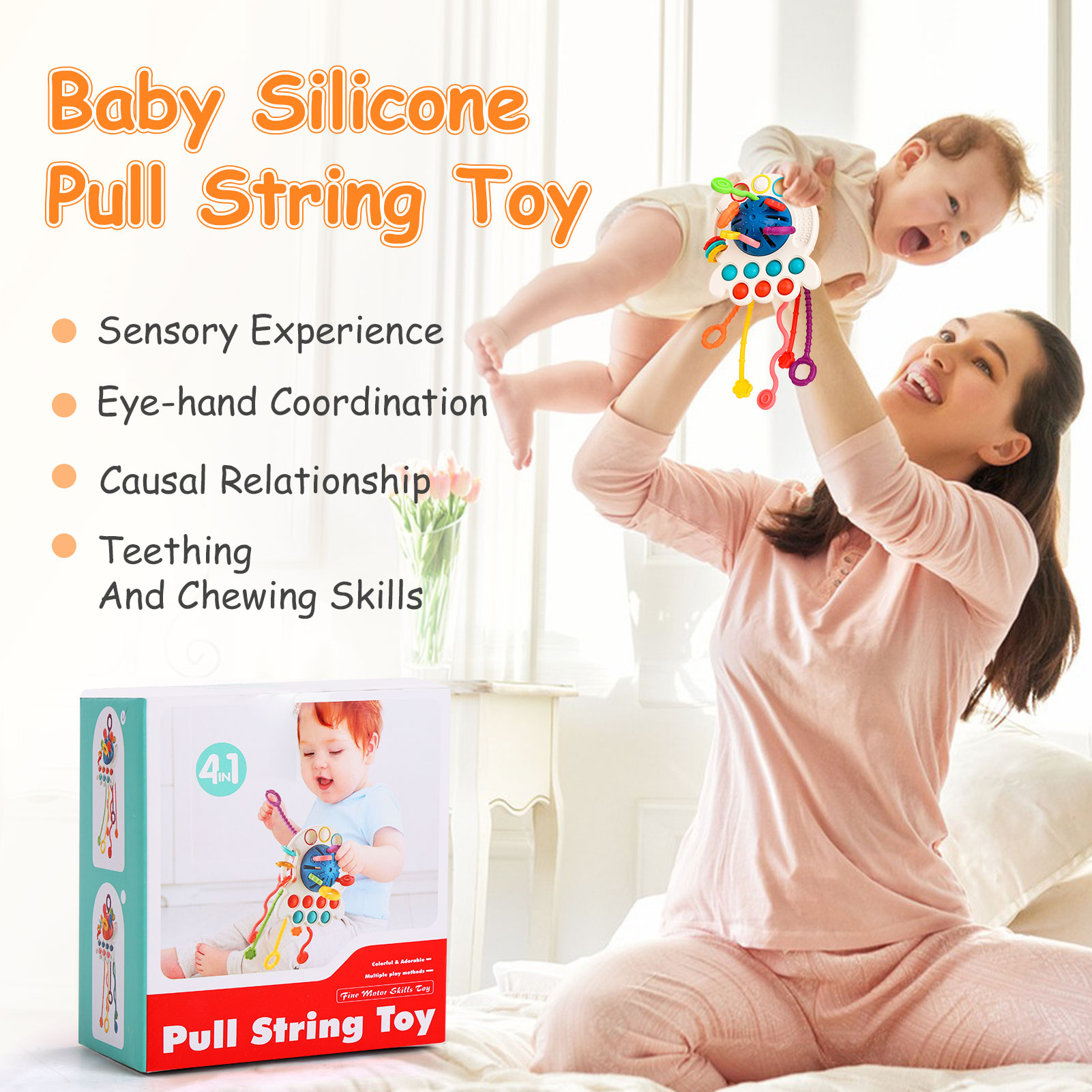 You can use this silicone pull toy as a parent-child toy to play with your child. which will keep the kids occupied and soothe the baby’s travel jitters.Made from food grade and ABS for strength, comfort and durability,The food grade silicone toys can relieve the discomfort of the baby during teething. The pull string toys are sized for little hands to grasp and feature flexible, soft and smooth edges for curious babies to explore with all their senses. The moderate size is suitable for carrying in cars, trains and airplanes for travel.