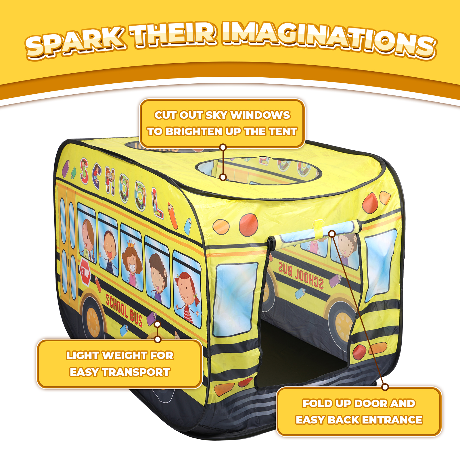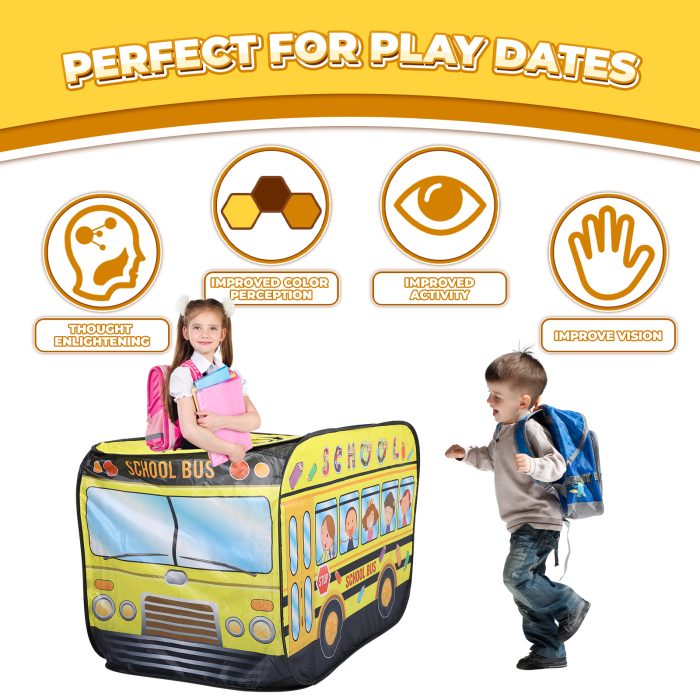 Travel Buddy – Take the fun on the road with the School Bus Pop Up Tent – your ultimate travel buddy! Its lightweight and compact design makes it easy to pack in your car trunk, while its durable materials can withstand any adventure – at the beach or in the park. Surely, it will keep your little ones entertained no matter where you go!